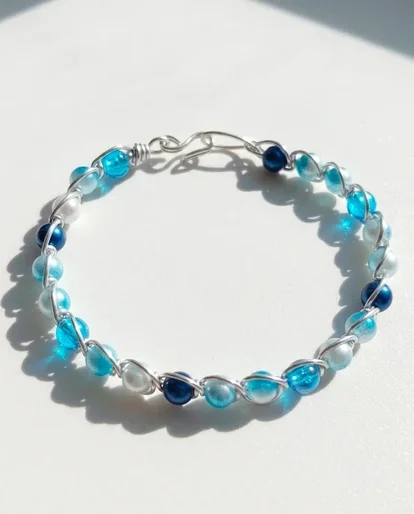 Prachtige, handgemaakte armband met een uniek vlechtwerk van sieraaddraad (wire-wrapping). De armband bevat glaskralen in verschillende tinten blauw, turquoise en parelmoer wit. Een echte eyecatcher die prachtig glinstert in de zon!