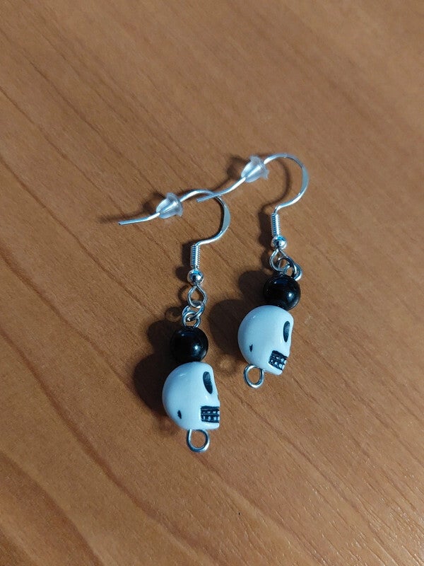 Stoere oorbellen met witte skull, zwarte kraal en ziloverkleurige oorhaken. Licht, comfortabel en handgemaakt.Perfectvoor een gothic of alternative look