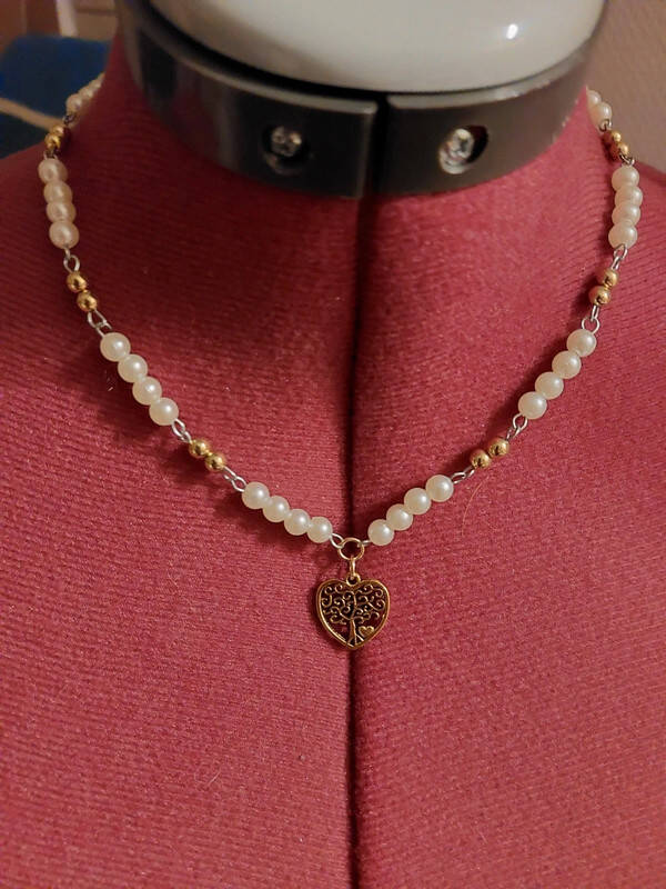 Prachtige handgemaakte ketting met witte parels en glanzende gouden acryl kralen. Het middelpunt is een gouden hart-hanger met levensboom, symbool van kracht, groei en verbondenheid 🌳💛