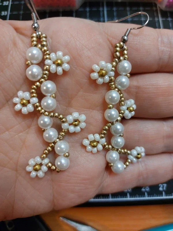 Prachtige handgemaakte oorbellen met parelachtige kralen en fijne bloemetjes van rocailles. Elegant en licht om te dragen. De combinatie van wit en goudkleur geeft ze een romantische en tijdloze uitstraling. Perfect voor een speciale gelegenheid of om je dagelijkse outfit net dat beetje extra te geven.