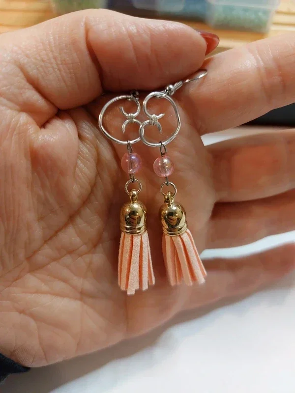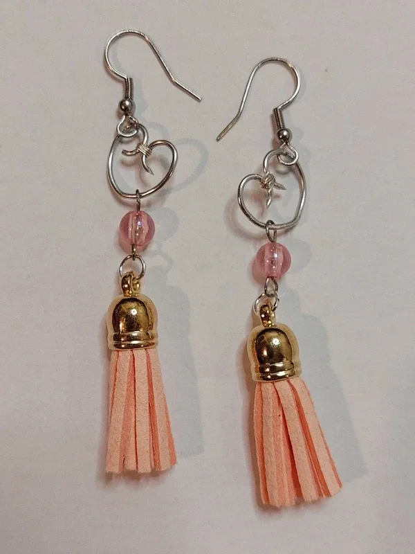 Prachtige oorbellen met een romantische twist. Een unieke combinatie van zilveren hartjes, roze kralen en perzikkleurige tassels!